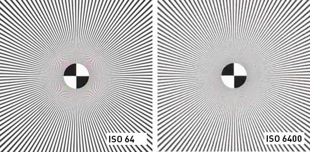 Bei der Vergrößerung des interessanten Bereiches auf dem Simensstern wird die Auflösung bei den verschiedenen ISO Einestellungen deutlich. Hier bei ISO 64 (links) und ISO 6400 (rechts).
